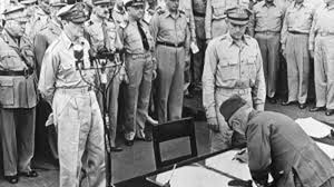 Trước 9 giờ sáng ngày 2 tháng 9 năm 1945, trên chiến hạm Missouri đang đậu trong vịnh Tokyo, trước sự hiện diện của các đại diện các nước Liên Xô, Trung Quốc, Anh, Úc, Tân Tây Lan, Canada và Pháp, Tướng Douglas Mac Arthur, Tư lệnh Lực lượng Mỹ, nhận lời tuyên bố đầu hàng vô điều kiện của quân đội Nhật. Về phía Nhật, Tân Ngoại trưởng Shigemitsu và Tướng Umezu Yoshijiro, Tổng Tham mưu trưởng Quân đội, ký kết văn kiện này. Thế là Đệ nhị Thế chiến tại mặt trận Thái Bình Dương kết thúc.