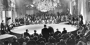 Sau 14 cuộc thảo luận, hai bên thoả thuận là bàn tròn đường kính 8m và có hai bàn thư ký ở hai đầu.