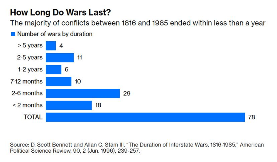 „Vậy điều gì sẽ xảy ra tiếp theo?“ là vấn đề mà tôi được hỏi nhiều lần. Để đi đến điểm mấu chốt đó, chúng ta hãy quay trở lại với khoa học chính trị, bắt đầu bằng trường hợp lạc quan (mà trong tâm trí tôi cho là tương đương với „những năm 1970, không phải những năm 1940“). Hầu hết các cuộc chiến đều ngắn ngủi. Theo một bài báo năm 1996 của D. Scott Bennett và Allan C. Stam III, cuộc chiến trung bình giữa năm 1816 và 1985 chỉ kéo dài 15 tháng. Hơn một nửa các cuộc chiến trong mẫu của họ (60%) kéo dài ít hơn sáu tháng và gần một phần tư (23%) ít hơn hai tháng. Kéo dài hơn hai năm là ít hơn một phần tư (19%). Do đó, có một cơ hội có thể chấp nhận được là cuộc chiến ở Ukraine sẽ kết thúc tương đối sớm.