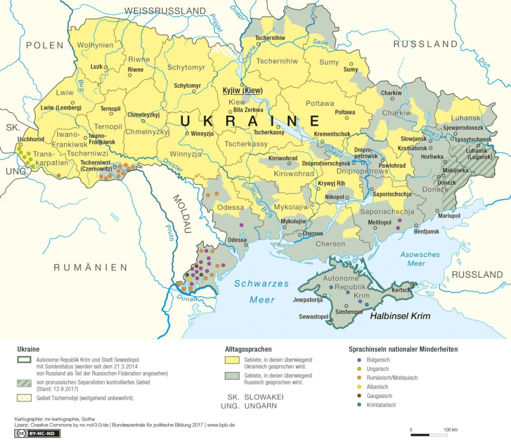 Từ khi Ukraine giành được độc lập năm 1991, quy chế chính thức của tiếng Nga (khoảng 17% dân số Ukraine là người dân tộc Nga), việc giải thích lịch sử Sa hoàng và Liên Xô, và định hướng địa chính trị của Ukraine đã là các chủ đề thường xuyên gây ra nhiều tranh cãi trong các cuộc diễn ngôn công khai của Ukraine. Nhưng trong hai thập niên qua, những cuộc tranh luận này đã diễn ra trong êm thắm. Không giống như ở một số quốc gia thời hậu Xô Viết khác như Estonia, Georgia hoặc Latvia, các vấn đề về bản sắc, dân quyền và văn hóa đã được tự do đề cập.