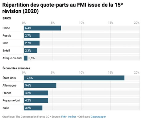 Tuy nhiên, bất chấp những thay đổi quan trọng trong nền kinh tế thế giới, các nền kinh tế phát triển vẫn tiếp tục chiếm đa số trong việc ra quyền quyết định này. Lần sửa đổi thứ 15 được trình bày vào năm 2020 không dẫn đến bất kỳ thay đổi nào đối với hạn ngạch, nó làm trầm trọng thêm sự bất mãn của các nước mới nổi, khối BRICS vẫn ở vị thế yếu so với các nền kinh tế tiên tiến. Một số thay đổi đã được đề xuất, đặc biệt là trong phương pháp tính toán, cho đến nay vẫn chưa có kết quả. Phương pháp này hiện đang đề cập, theo thứ tự về tầm quan trọng của GDP, mức độ mở cửa của nền kinh tế, sự ổn định và khối dự trữ vàng và ngoại hối của đất nước. Sau đây là bảng phân bổ hạn ngạch của QTTQT: