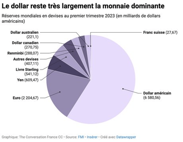 Đặc tính quốc tế của một loại tiền tệ được đánh giá bằng cách sử dụng nó ra bên ngoài lãnh thổ của quốc gia, để trao đổi thương mại và tài chính, như một loại dự trữ ngoại hối và trên thị trường ngoại hối. Nó là một chỉ dấu của niềm tin trong các giao dịch quốc tế. Kể từ khi đồng euro ra đời vào năm 1999, tỷ trọng dự trữ của đồng đô la tại các ngân hàng trung ương đã tăng từ 71% đến 54,7% vào năm 2023, đồng euro ở mức 18,3% và đồng nhân dân tệ ở mức 2,39%. Do đó, sự suy giảm trọng lượng của đồng đô la là có thật, nhưng đồng tiền này vẫn tiếp tục chế ngự các đồng tiền khác với một khoảng cách lớn, Nhân dân tệ đang chiếm vị trí thứ bảy. Sau đây là bảng thống kê chứng minh: