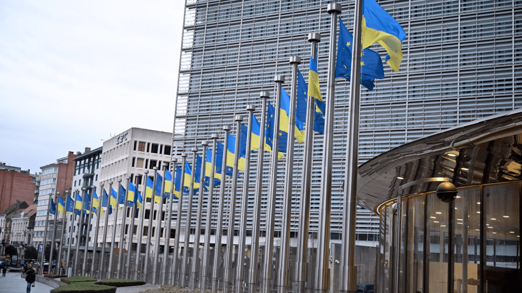Cờ Ukraine trước tòa nhà Ủy ban Liên Âu: Chính sách mới của Tổng thống Trump khiến chính sách quốc phòng của Liên Âu trở thành ưu tiên, ảnh Anadolu / Dursun Aydemir